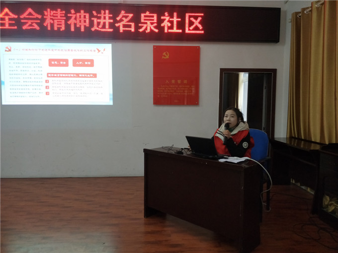 8日上午,在名泉社区市民学校里,湖北省理论宣讲优秀宣讲员朱运琴自制课件《增强制度自信,书写“中国之治”新篇章》,为辖区50余名党员、居民宣讲十九届四中全会精神,让大家送上新鲜的精神“食材”。