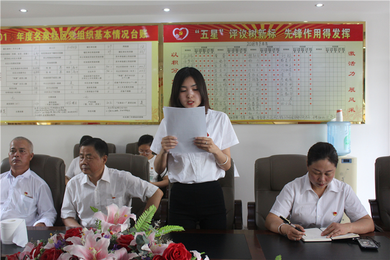 6月25日,名泉社区党支部召开党员大会,会上入党积极分子田娇枝宣读了入党申请书和思想汇报,两名培养人分别介绍了申请人的表现情况,支委会报告申请的综合考察意见及政审情况,与会党员经过讨论后同意吸收田娇枝为中共预备党员。社区党支部书记对其提出要求,要入党前和入党后保持一致,更加高标准、严要求来规范自己言行,争取早日成为一名真正的共产党员。