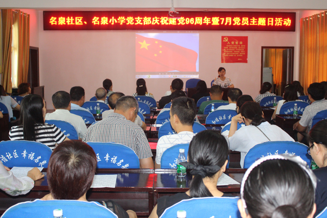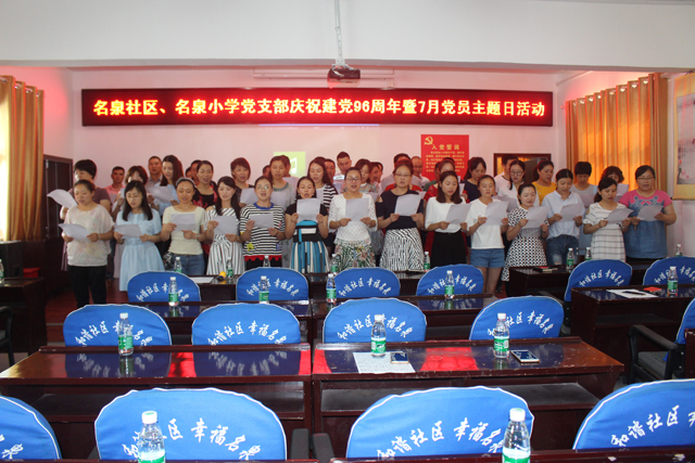 1日,名泉社区、名泉小学党支部联合开展庆祝建党96周年暨7月党员主题日活动,共同庆祝中国共产党成立96周年。活动中与会党员唱国歌、重温入党誓词、通报名泉社区党支部党员6月实现“微心愿”的情况、2017年上半年“五星”党员评定结果、社区党支部书记为大家上《学习廖俊波同志的一身“党性”》的党课,最后在大合唱《社会主义好》的旋律中,表达对中国共产党的热爱。