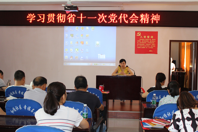 省十一次党代会报告会以《开启“建成支点 走在前列”的新征程吹响全面建成小康社会的进军号角》为题,从大会概况、大会报告主要精神和报告内容三个方面对湖北省第十一届党代会精神进行了全面解读。报告以“五位一体” 和“四个全面”为主线,通过“五个湖北”和党的建设来阐明了省第十届党代会以来,湖北取得的成就,同时提出了新时期奋斗的“六新”目标。社区将积极贯彻落实省十一次党代会精神,努力为居民群众营造治理有序、服务完善、环境优美、便民利民、平安和谐的社区。