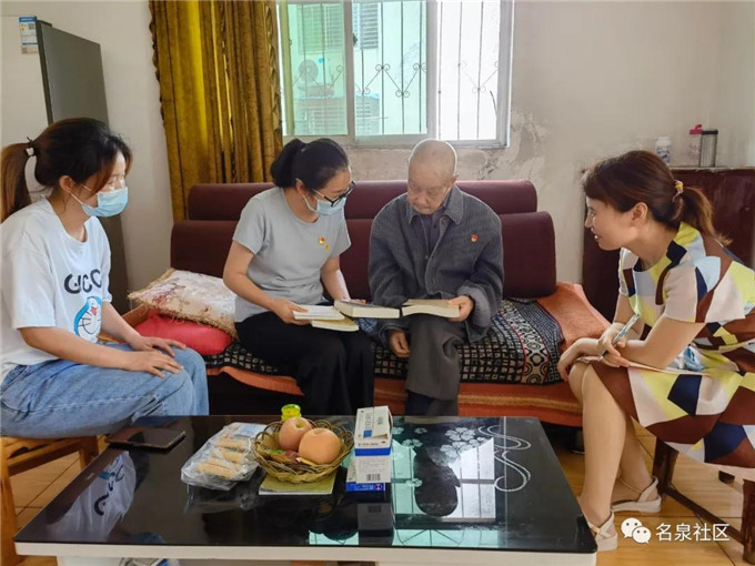 日前,名泉社区党支部4名年轻党员上门看望老党员魏章壁,为他送去《中国共产党简史》等红色读物,并听老人讲述自己与党的故事。